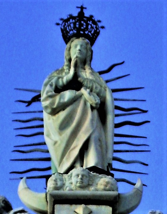 • Como remate, un último pedestal, sostiene a la Inmaculada de mármol blanco con rayos luminosos que parten de su cuerpo y una corona sobre su cabeza.